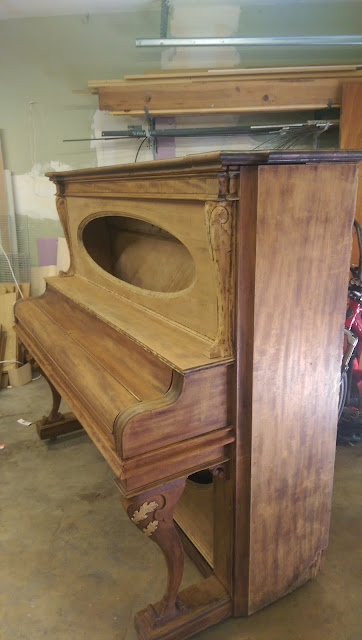 Here is the piano all stripped and sanded down, including a bunch of walnut-shell blasting on the detail work. It doesn't necessarily LOOK like it's all de-finished, but that's because the mahogany has such huge variations in pore size (which is what makes it pretty, eventually):